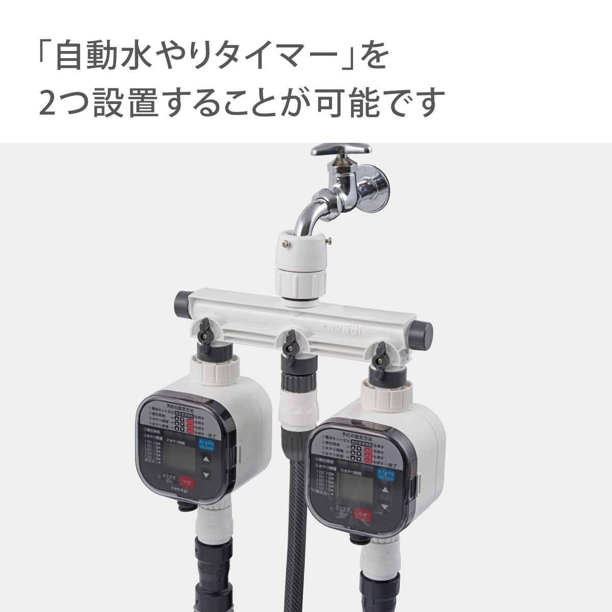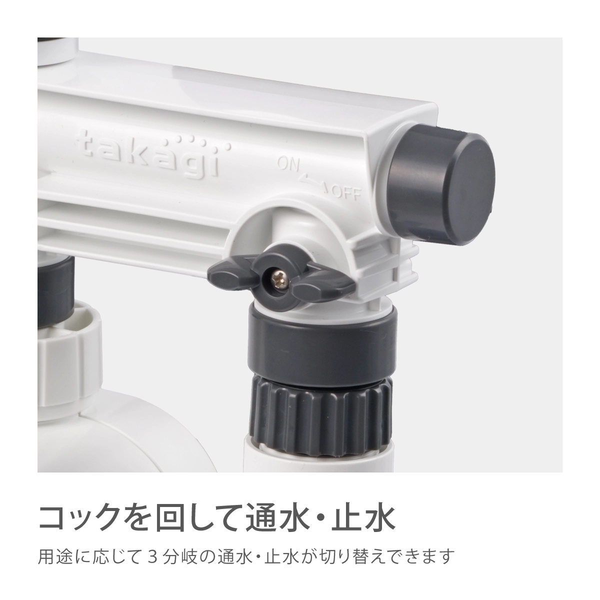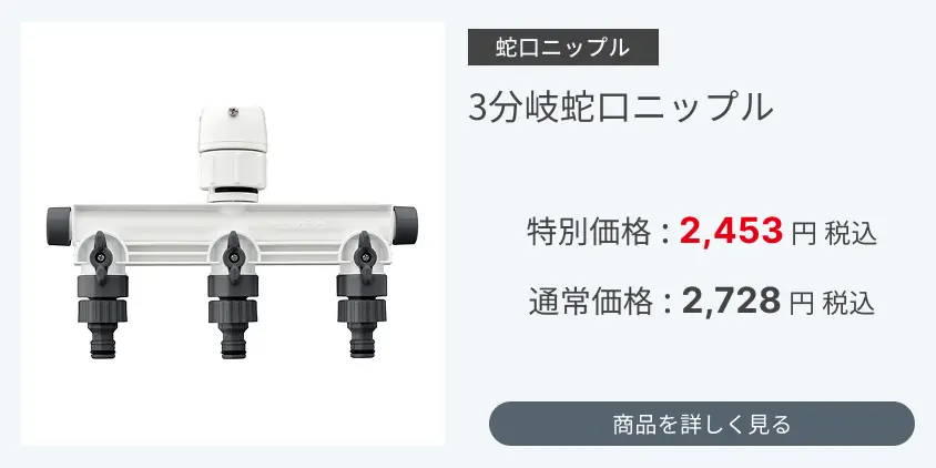 蛇口を3つに分岐することができます。例:①ホースリール接続用 ②水やりタイマー用 ③手洗い用など用途によって使い分けることができます。