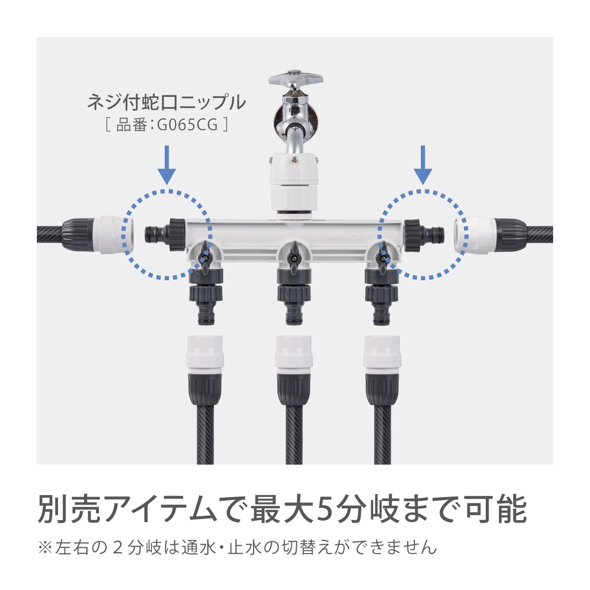 最大5分岐も可能です。左右の分岐には、ネジ付蛇口ニップルセット(G065CG)等が必要です。