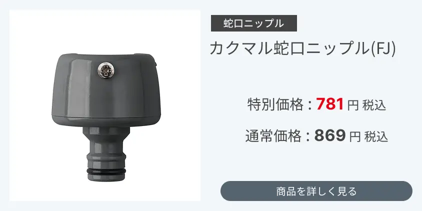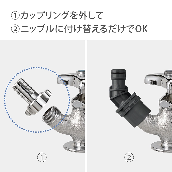 そんな時は、カップリングを外し、蛇口ニップルを取り付けることで、簡単に取り付け・取り外しができ、水漏れもなく快適にホースを扱うことができます。