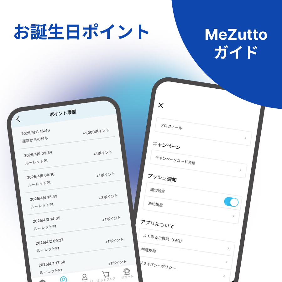 マイページアプリのお得なサービスの一つで、アプリをダウンロードしてプロフィールにお誕生日をご登録いただくとお誕生日月の1日に1,000Pt獲得することができます。