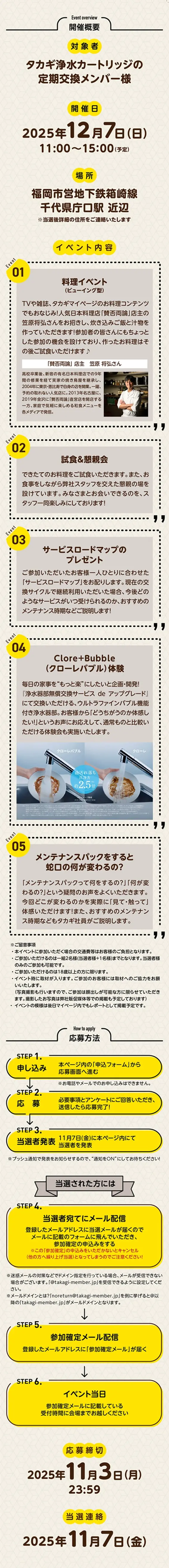 料理イベントや、タカギ製品をより知っていただくためのプログラムを準備しておりますので、ぜひみなさま奮ってご応募ください!