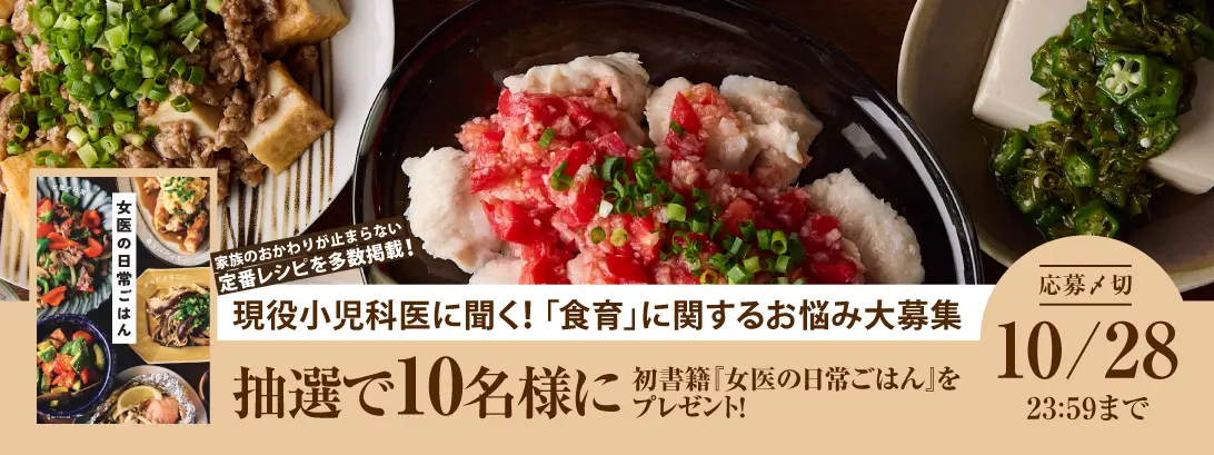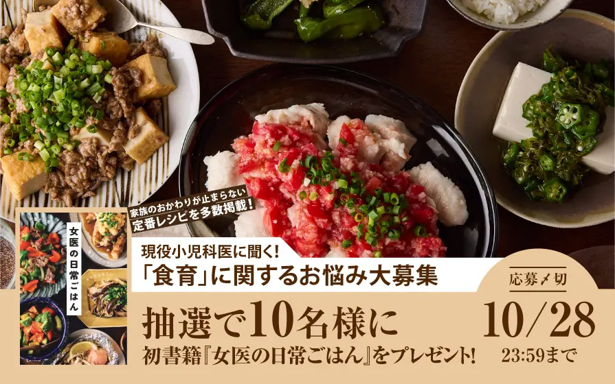今回ご応募いただいた方に抽選で10名に現役の小児科医として働きながら4児を育てるYouTuber「女医の日常」さんの初書籍『女医の日常ごはん』をプレゼントいたします!