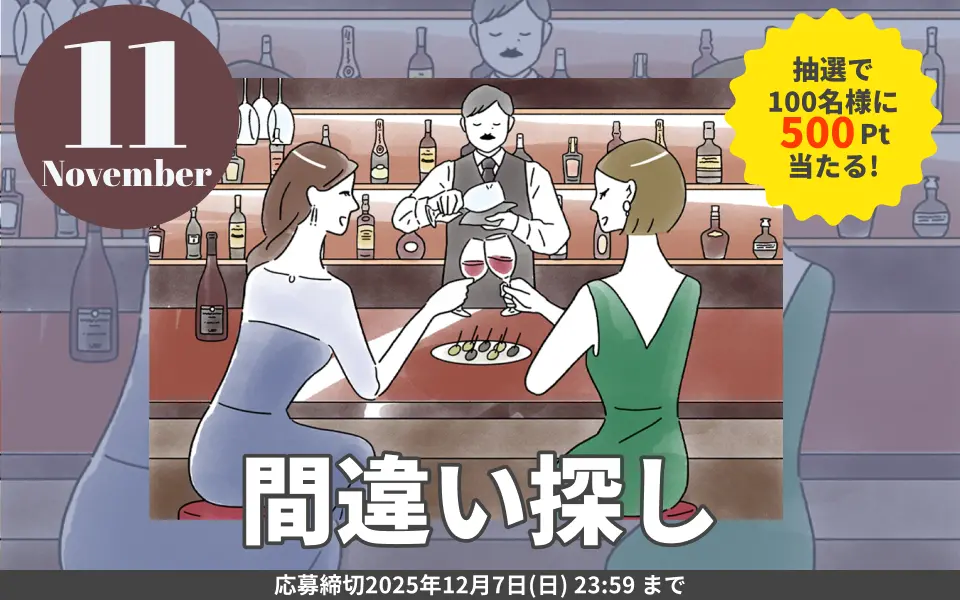 11月はボジョレーヌーボー解禁ですね🍷今年の解禁日は11月20日とのことです。そこで今回はワインを楽しんでいる様子の間違い探しになっています!
