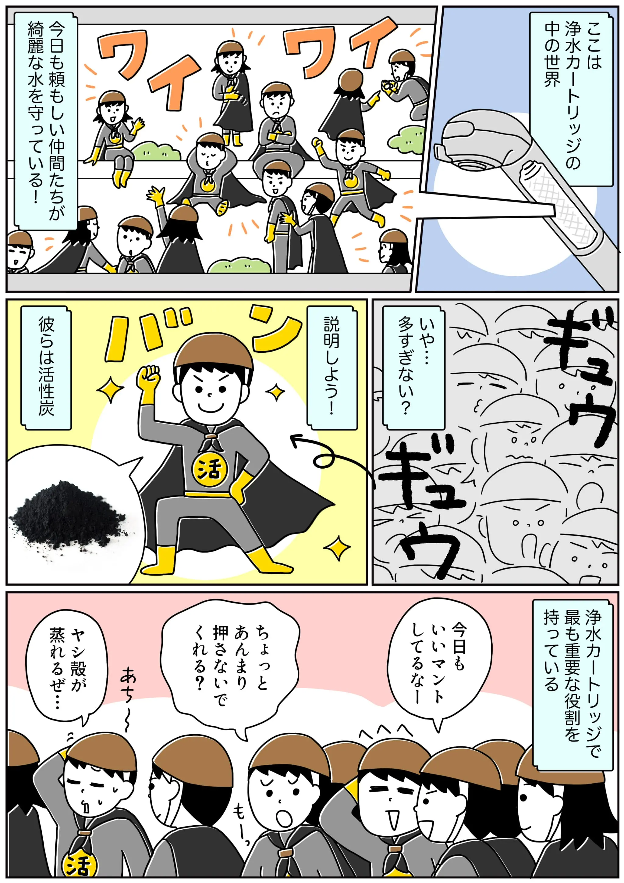 浄水カートリッジにまつわるクイズに答えると100Ptをプレゼントします!答えのヒントはマンガの中にあるので、漫画を読んてクイズに挑戦してください!