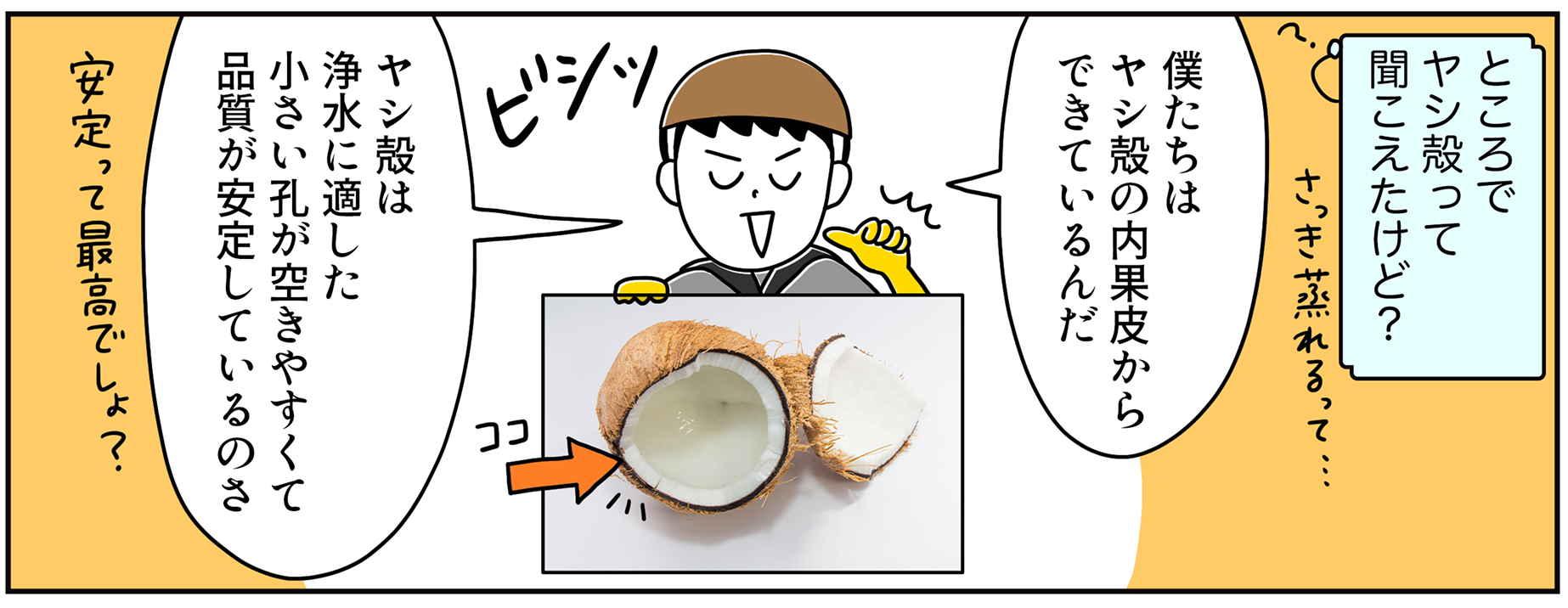 もちろん、カートリッジの中にココナッツが丸ごと入っているわけではありません(笑)。使われているのは、ヤシの内側にある固くて濃い茶色の部分──「内果皮(シェル)」と呼ばれる層だけ。この部分をじっくり処理して、 “ヤシガラ活性炭”がつくられています。