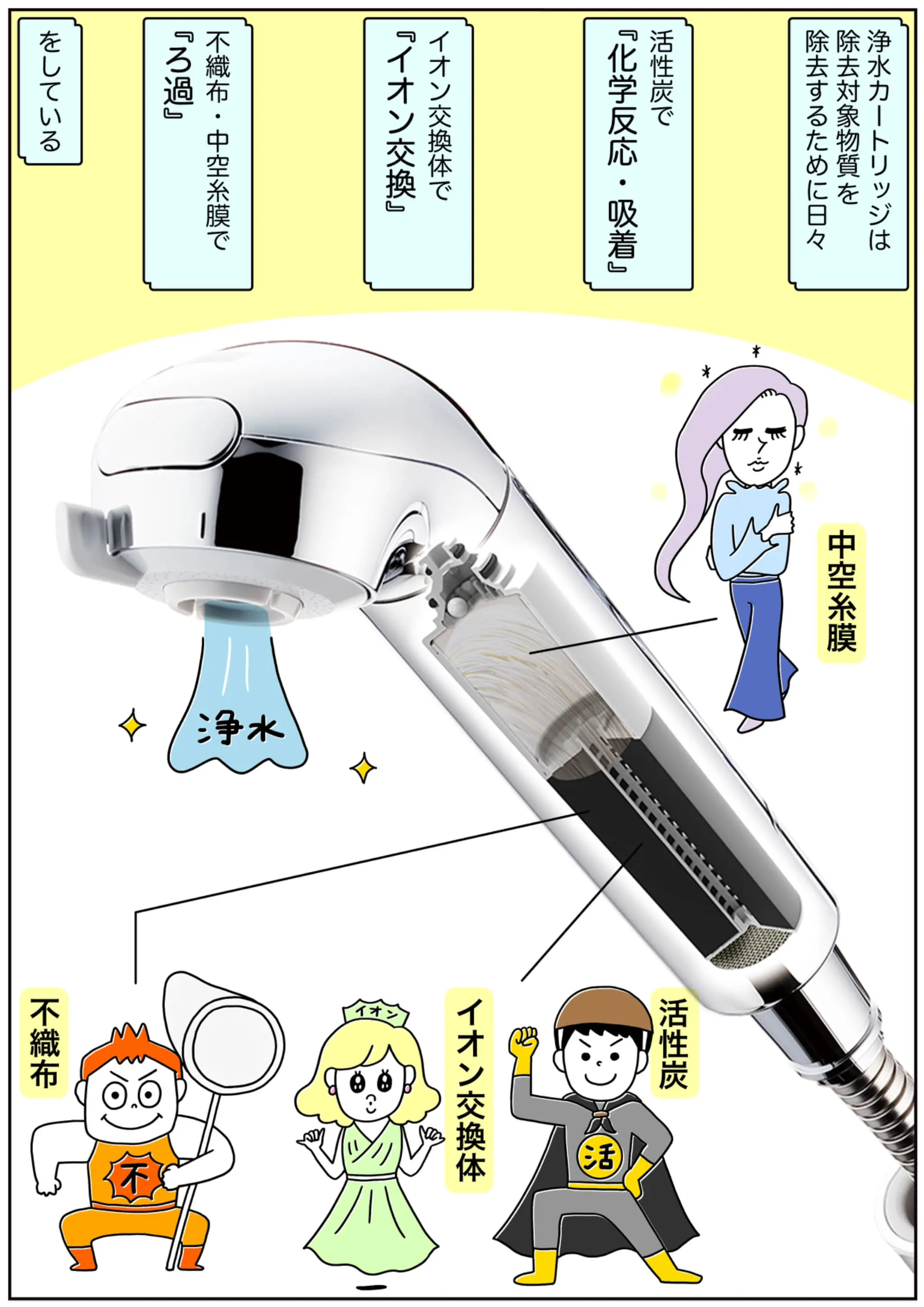 浄水カートリッジの中では、活性炭をはじめ、イオン交換体・不織布・中空糸膜といった仲間たちが、それぞれの得意分野を活かしながら毎日きれいな水をつくり続けています。とはいえ、そんなどんなカートリッジにも働ける“限界”があり、使い続けるほど性能は徐々に低下していきます。交換のタイミングを逃してしまうと、本来なら除去できるはずの物質が水の中に残ってしまうことも……。