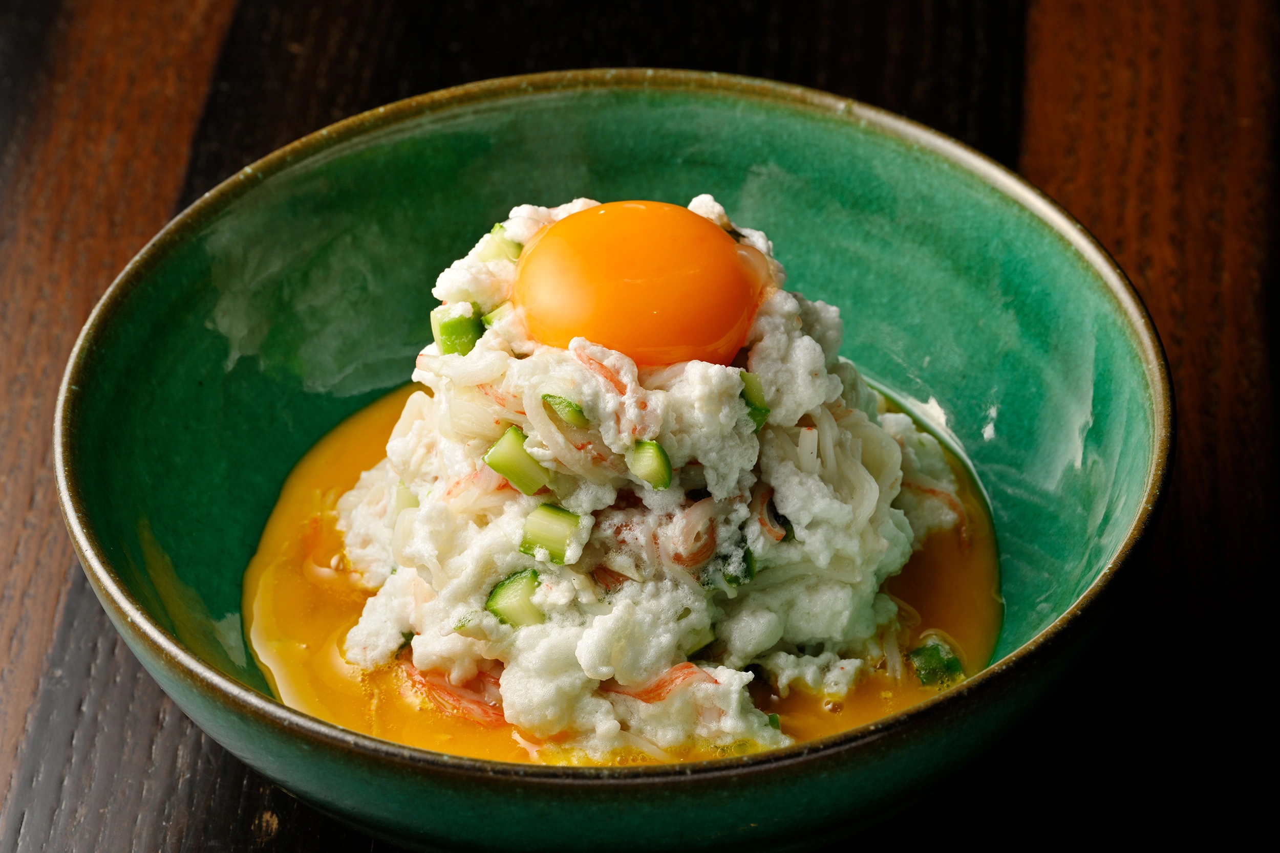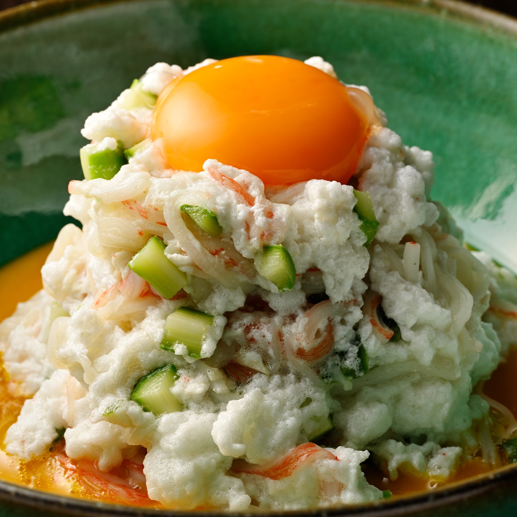 ⑥卵黄2個を溶いて器の底 に伸ばし、その上に⑤を盛り付けて、最後に上に溶いていない卵黄1個 をのせる。