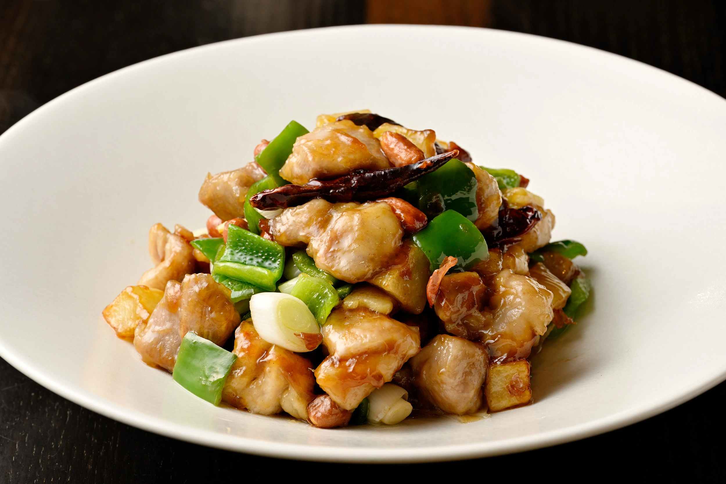 ⑧ ⑤をかき混ぜながら⑦にまわしかける。片栗粉が固まってきたら混ぜて炒め合わせ、最後に皮付きピーナッツを加える。