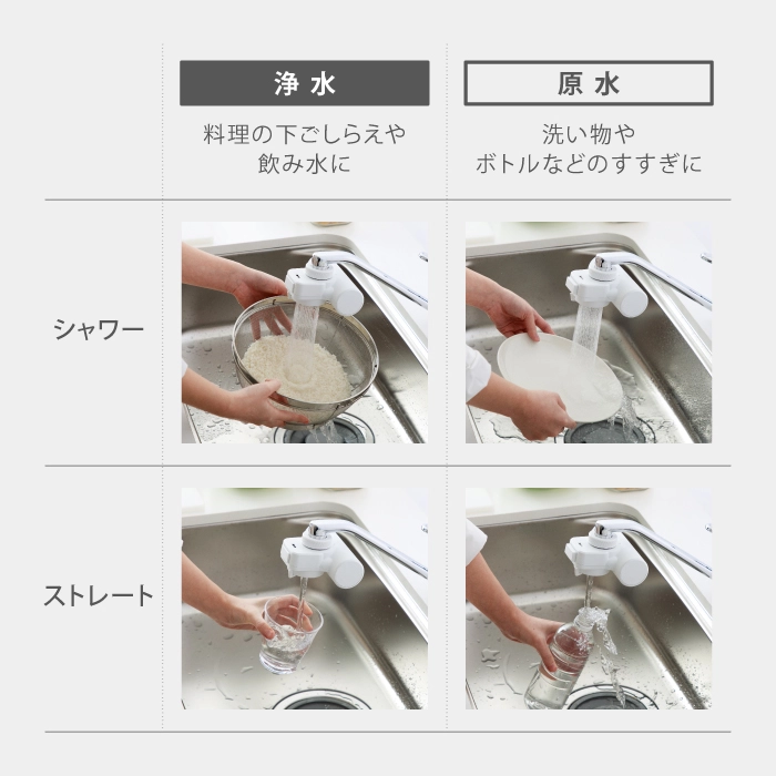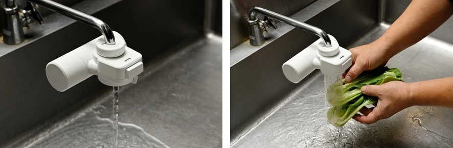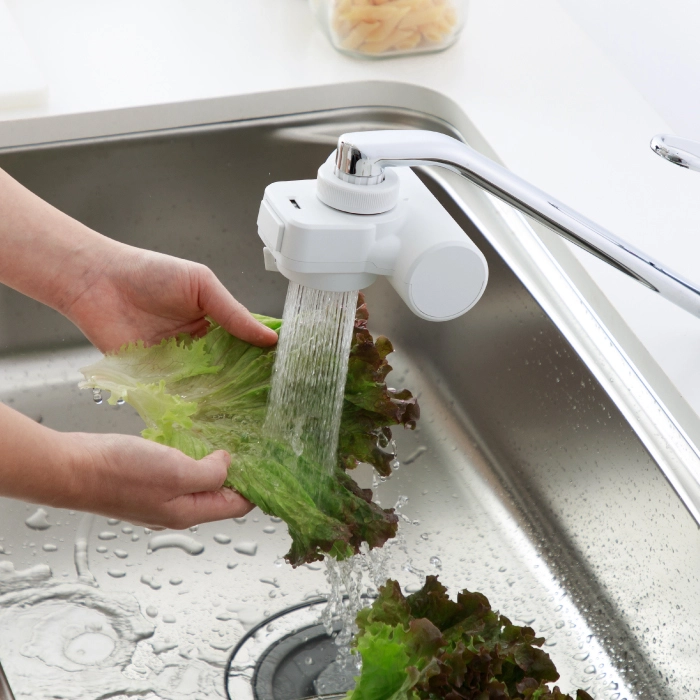 「浄水シャワー」は野菜洗いやお米を研ぐときにおすすめです。食材に含まれるビタミンを分解してしまう残留塩素を除去した浄水で素材本来のおいしさをお楽しみください。