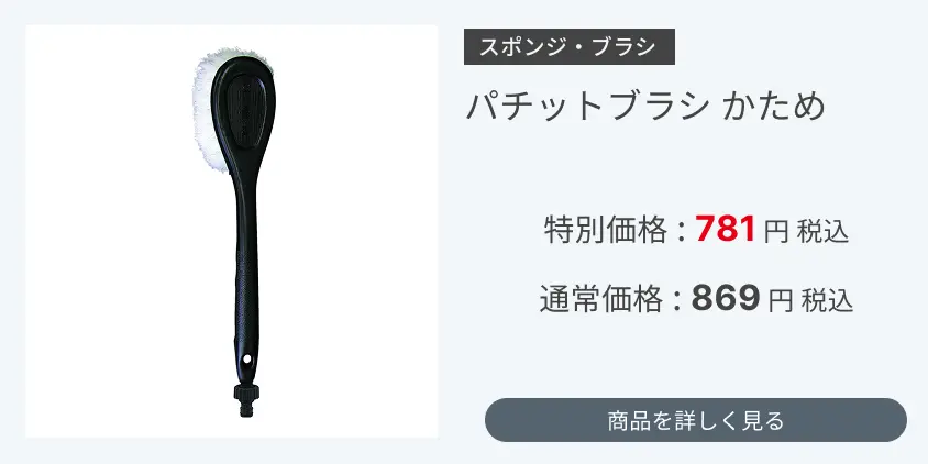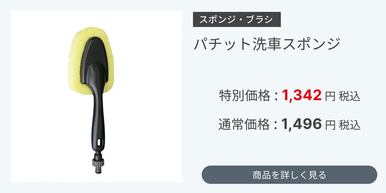 今回は、タカギの『パチット洗車スポンジ 』を使いました。柄があるから大型車の屋根の中央部もラクに洗えるのが魅力です。