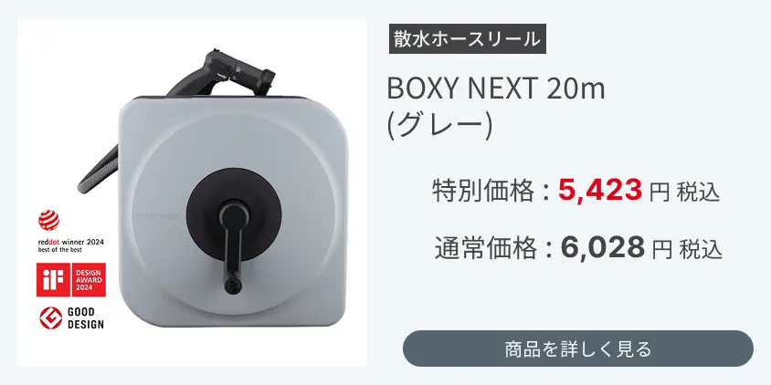 私が使っているのは、タカギの『BOXY NEXT 20m(グレー) 』です。ノズルを引っ張るだけでホースがサーっと滑り出てきて、ストレスなし!巻き取りもしやすいし、ノズルには洗車に必要な水流が全部揃っているので、日ごろから愛用しているシリーズです。