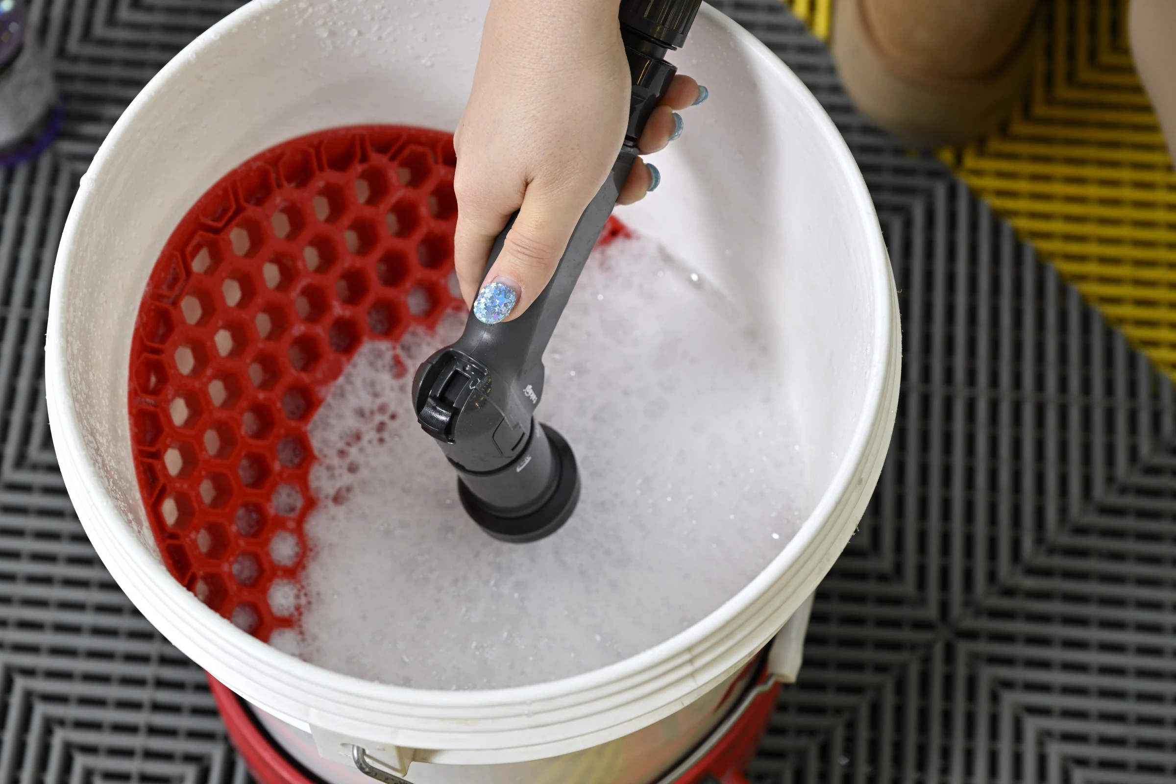 まずバケツに中性洗剤を入れ、ホースで勢いよく水を出して泡立てておきます。