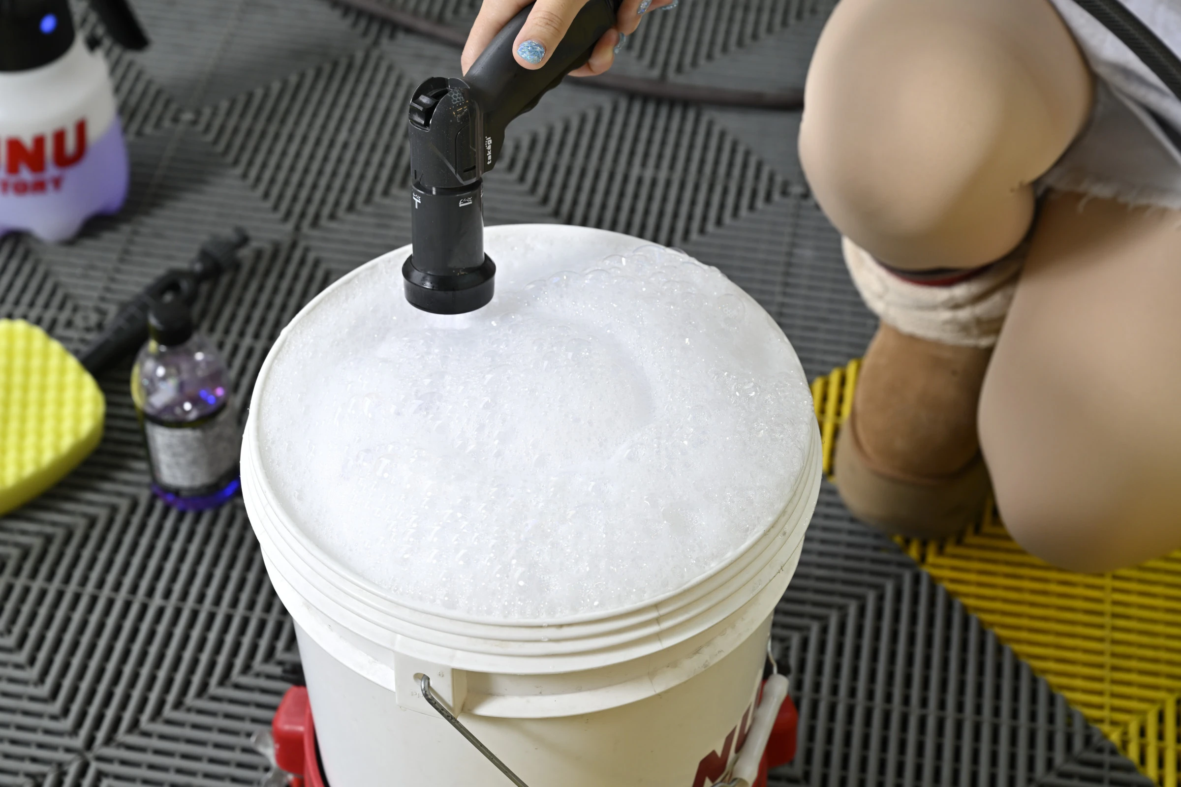 次にフォームガンでボディ全体に中性洗剤の泡を撒き、バケツの泡で洗っていきます。