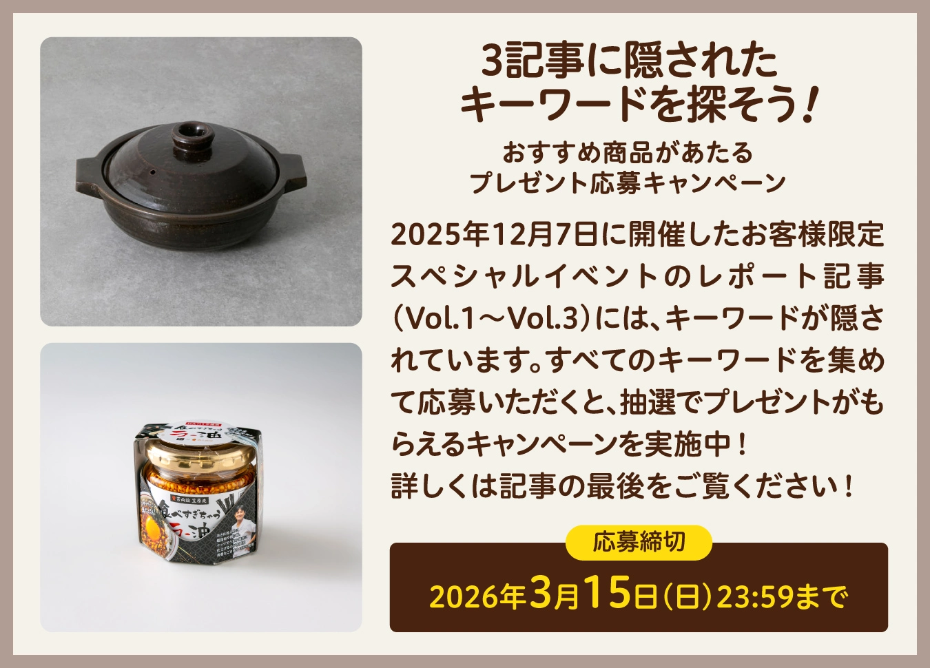 2025年12月7日(日)に開催されたお客様限定イベントのレポート記事(Vol.1~Vol.3)には、それぞれ1文字ずつ「キーワード」が隠されています。