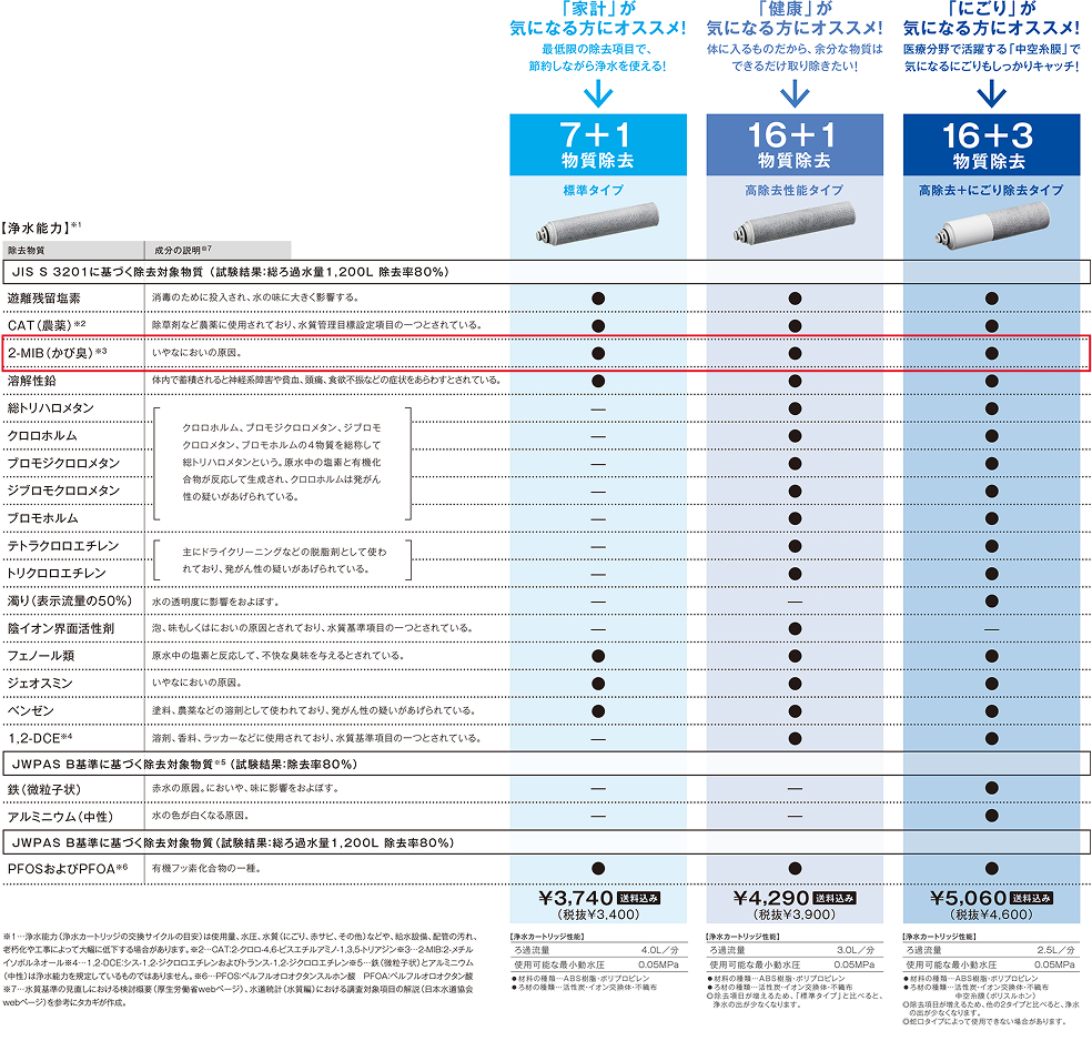 じゃーん!タカギの浄水器ではかび臭の原因って言われている「2-MIB」もしっかり除去してるんだよ!