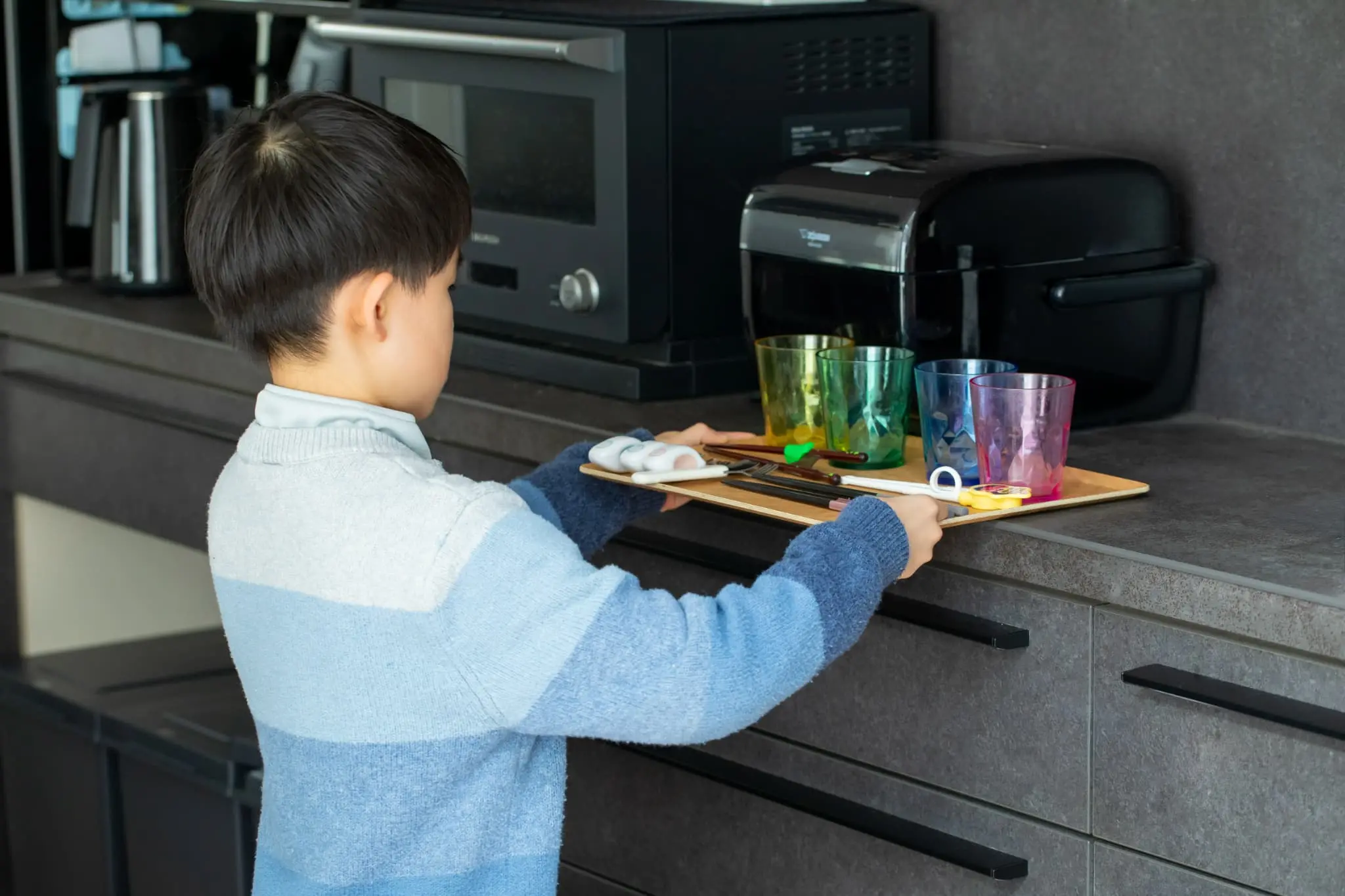 お手伝いができるようになったら、食事の準備を手伝ってもらうのもおすすめです。食器を運ぶ、切る、盛り付けるなど、お子さんができることを任せてみませんか。わが家では、長男が包丁で切った食材を使う日は「にぃにが切ってくれたごはんだよ」とみんなに伝えます。するとその場が盛り上がり、長男も嬉しいみたい。