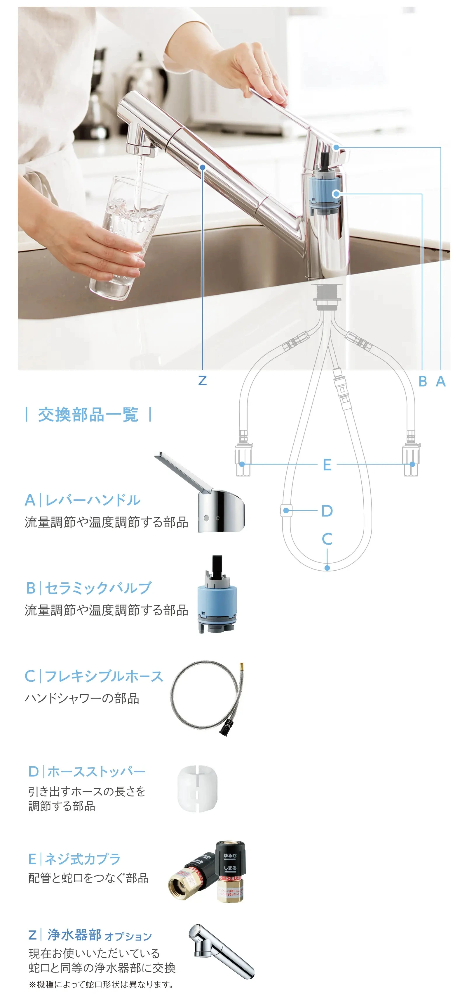 図が示す蛇口一体型浄水器の部品の内、A・B・C・D・E・Zを交換します。