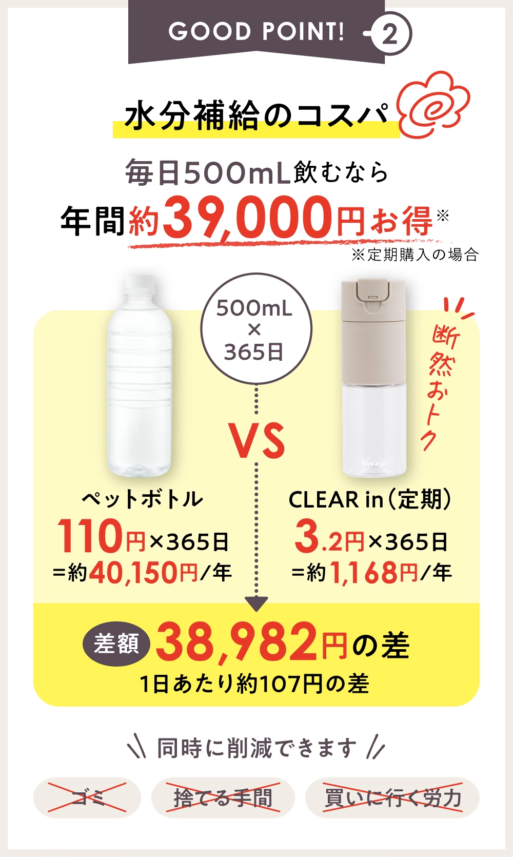 1日2リットルを飲んでも、約2か月使える浄水カートリッジです。これからの水分補給をコスパよく!そしてストレスなく!