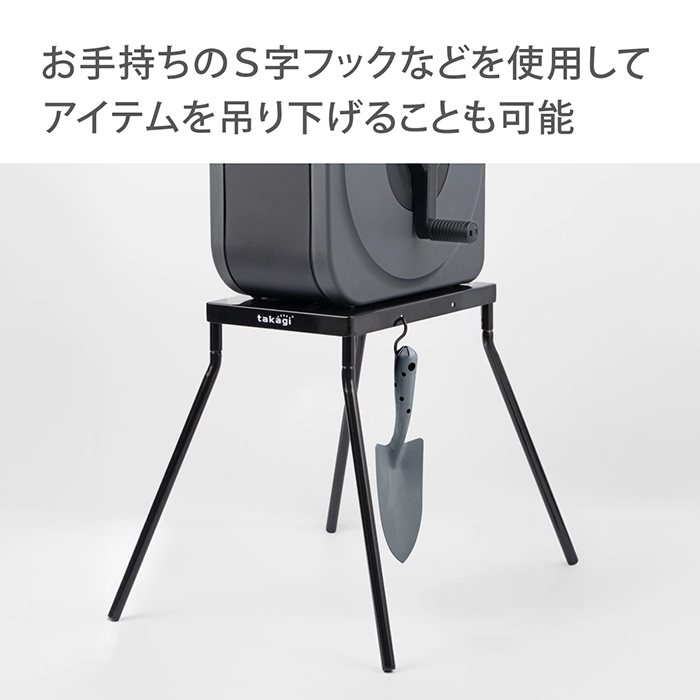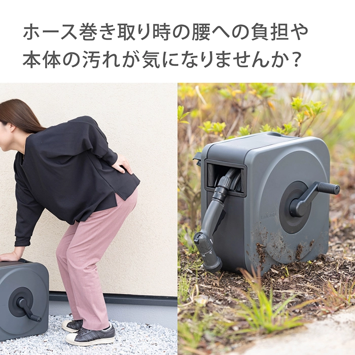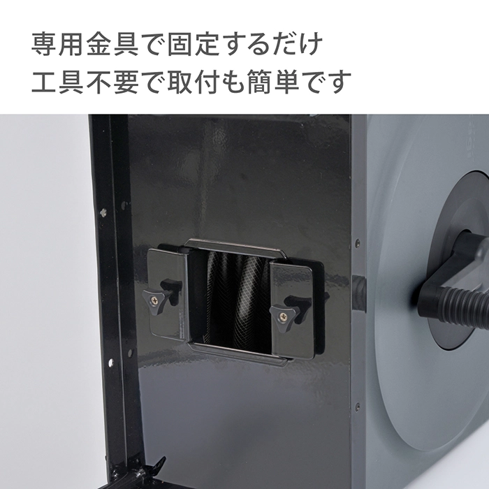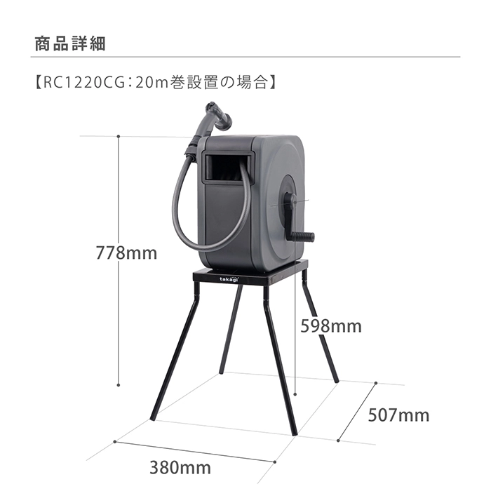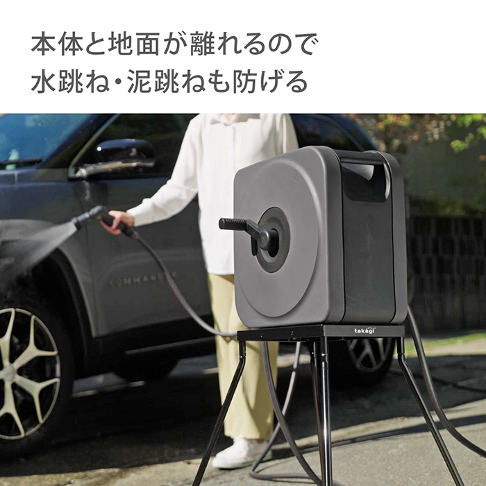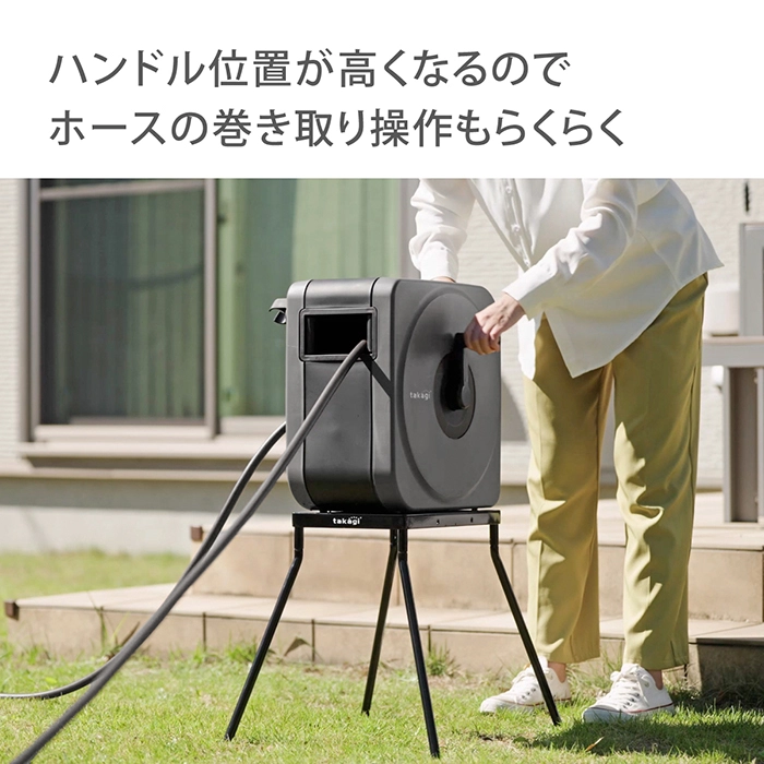 | 注意事項 | ・本製品は一般家庭での屋外散水用品です。それ以外の目的には使用しないでください。 ・破損によるケガを防止するため、スタンドおよびスタンドに取り付けたホースリールの上に乗らないでください。 ・炎天下でのご使用は本体が高温になり、火傷をするおそれがあります。 ・指を隙間ではさまないようにしてください。 ・転倒するおそれがあるため、ホースを勢いよく引き出さないでください。また、フック穴とフェンスなどを紐で結び倒れないようにしてください。 ・つまみネジのゆるみを定期的に確認し、増し締めをしてください。 |