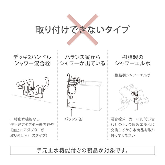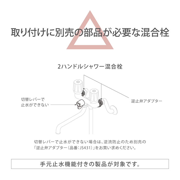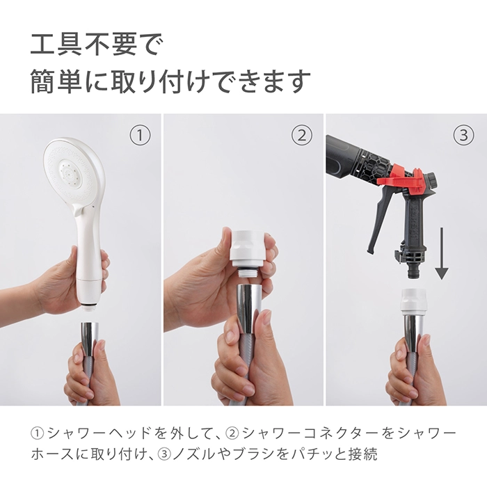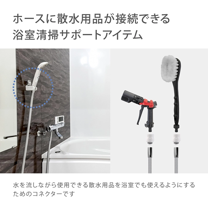 カテゴリ コネクター サイズ H120×W12×D40 mm 容量 60g JANコード 4975373201803 商品説明 お風呂でお使いの浴室用シャワーホースに取り付け、散水ノズルやブラシをワンタッチで接続できます。浴室や排水溝の清掃など、水圧の高い散水ノズルでの洗浄が可能です。各メーカーのシャワーホースに接続可能です。