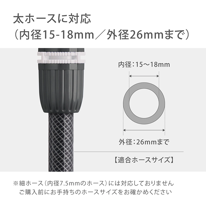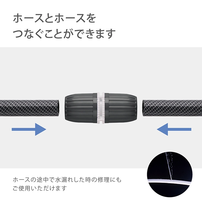 カテゴリ ホースジョイント サイズ H120×W120×D41 mm 容量 68g JANコード 4975373200325 商品説明 ホース同士をつないで延長できる商品です。ホースの一部が破損した場合にも、補修アイテムとして便利にお使いいただけます。太ホース(内径15-18mm/外径26mmまで)に対応しています。