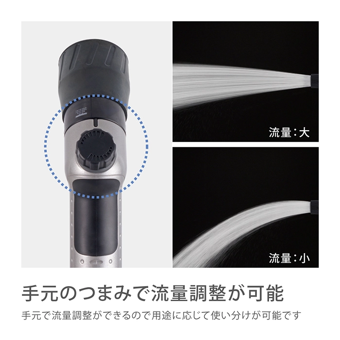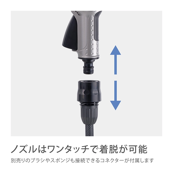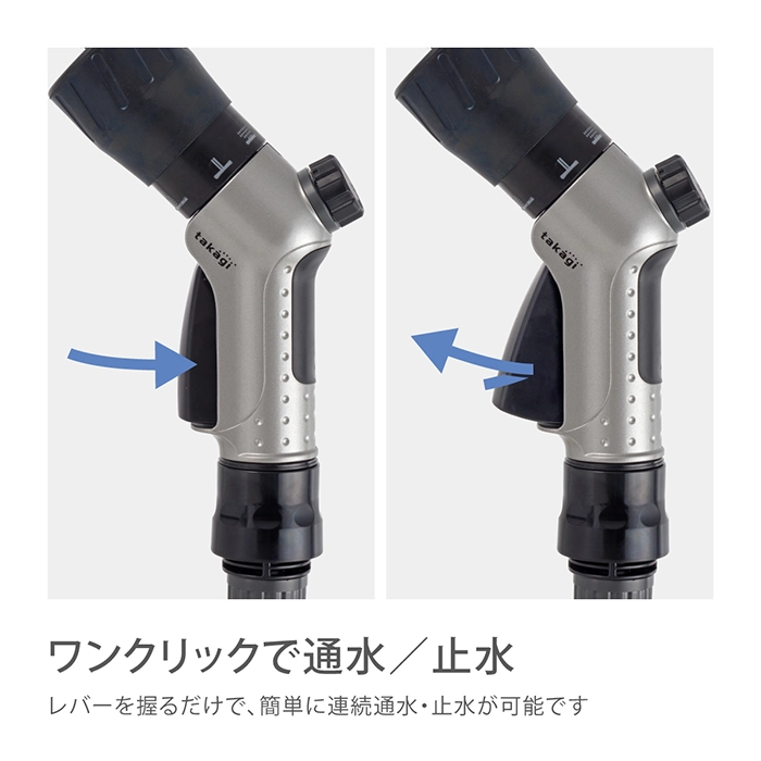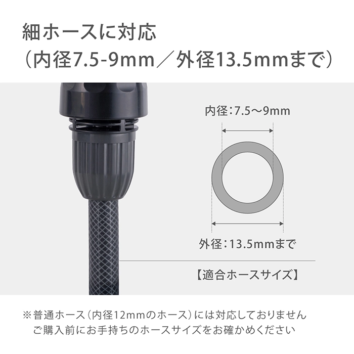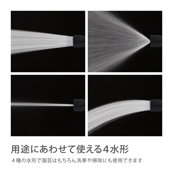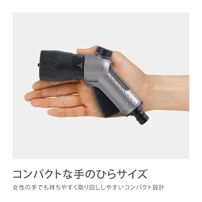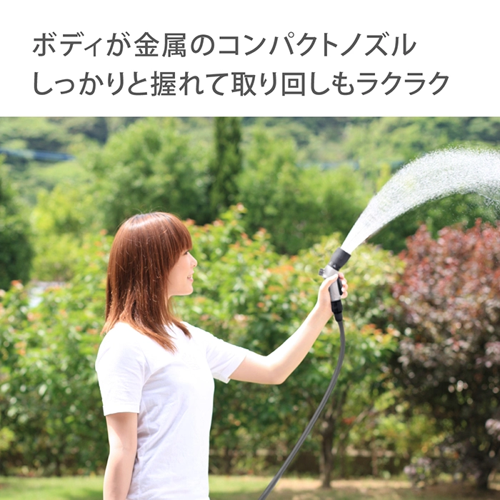 カテゴリ 散水ノズル JANコード 4975373202503 商品説明 ボディが金属でコンパクトタイプの散水ノズルです。水形がキリ・シャワー・ストレート・ジョロの4種類に切り替えができます。手元のつまみで流量調整ができます。細ホース(内径7.5-9mm/外径13.5mm)に対応しています。