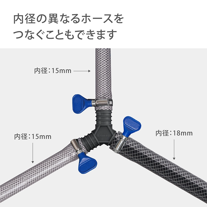 カテゴリ ホースジョイント 取扱説明書 →取扱説明書はこちら(PDF) サイズ H120×W122×D45 mm 容量 84g JANコード 4975373200233 商品説明 ホースバンドでホース同士をつなぐアイテムです。 三方向に分岐できます。 太さの違うホースも接続することができます。 太ホース(内径15-18mm/外径28mm)に対応しています。