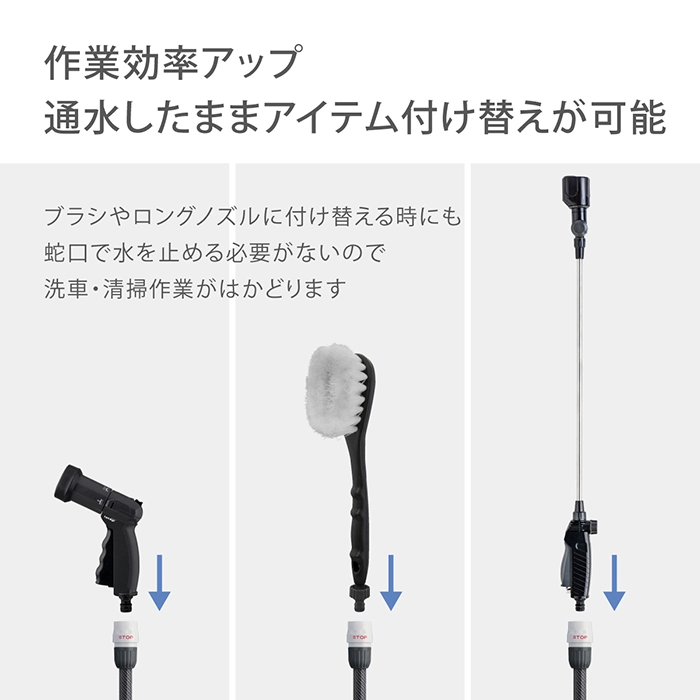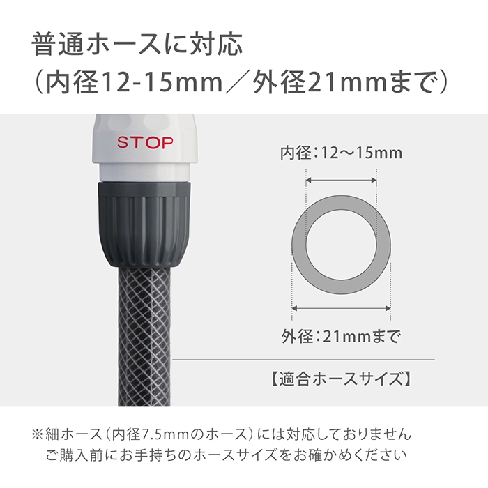 カテゴリ コネクター 取扱説明書 →取扱説明書はこちら(PDF) サイズ H120×W85×D40 mm 容量 60g 商品説明 ホースやノズルの取り外しがワンタッチになる便利なアイテムです。 通水したまま取り外しても水が噴き出さないストップ機能がついています。 普通ホース(内径12-15mm/外径21mmまで)に対応。