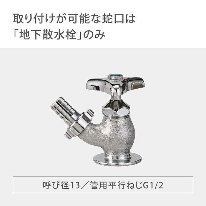 | 商品説明 | 地下散水栓蛇口に取り付けて、コネクター(別売り)付きホースの取り外しがワンタッチで接続可能です。 |