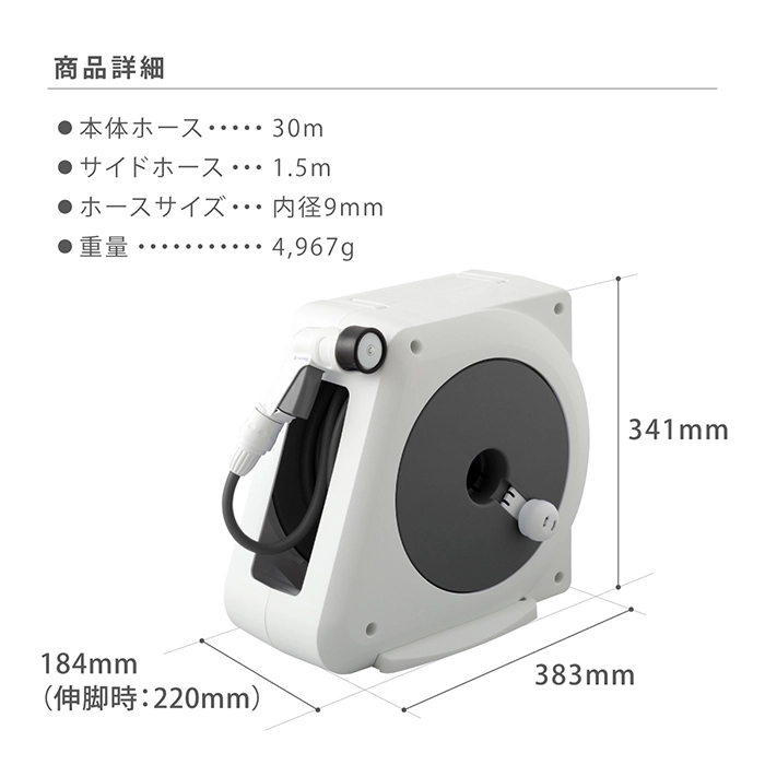 | 商品説明 | すっきり収納できる、軽量コンパクトタイプの散水ホースリールです。 最大使用可能水圧:0.7MPa |