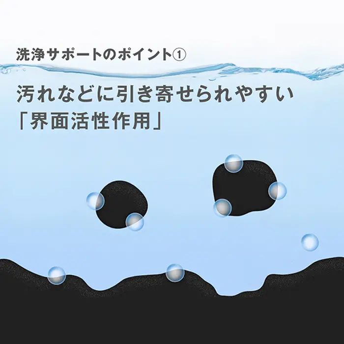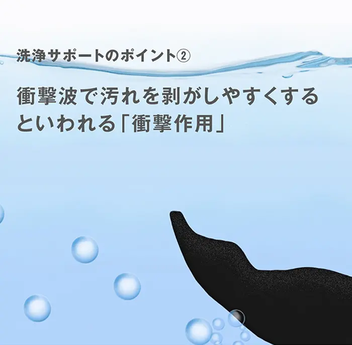 気泡が外力(超音波など)の影響で破裂する際に衝撃波が発生し、そのエネルギーにより付着した汚れを剝がしやすくするといわれています。こうした特性によって、洗浄をサポートすることが期待されています。