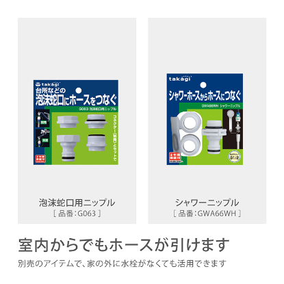 | 成分 | 最大使用可能水圧:O.7MPa(7kgf/㎠) 原料樹脂:ABS樹脂、ポリアセタール、ポリプロビレン、ポリアミド 金属材料:ステンレス、アルミニウム ゴム材料:EPDM、NBR ホース材料:塩化ビニル樹脂(糸入り) ホースサイズ:内径7.5mm、外径11mm |