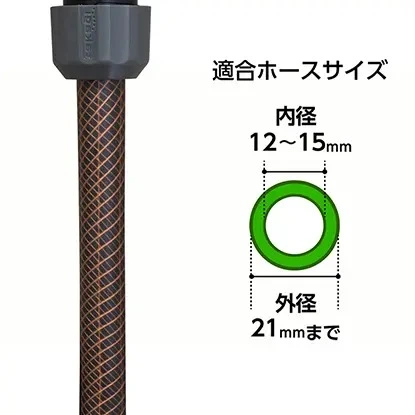 普通ホース(内径12-15mm/外径21mmまで)に対応しています