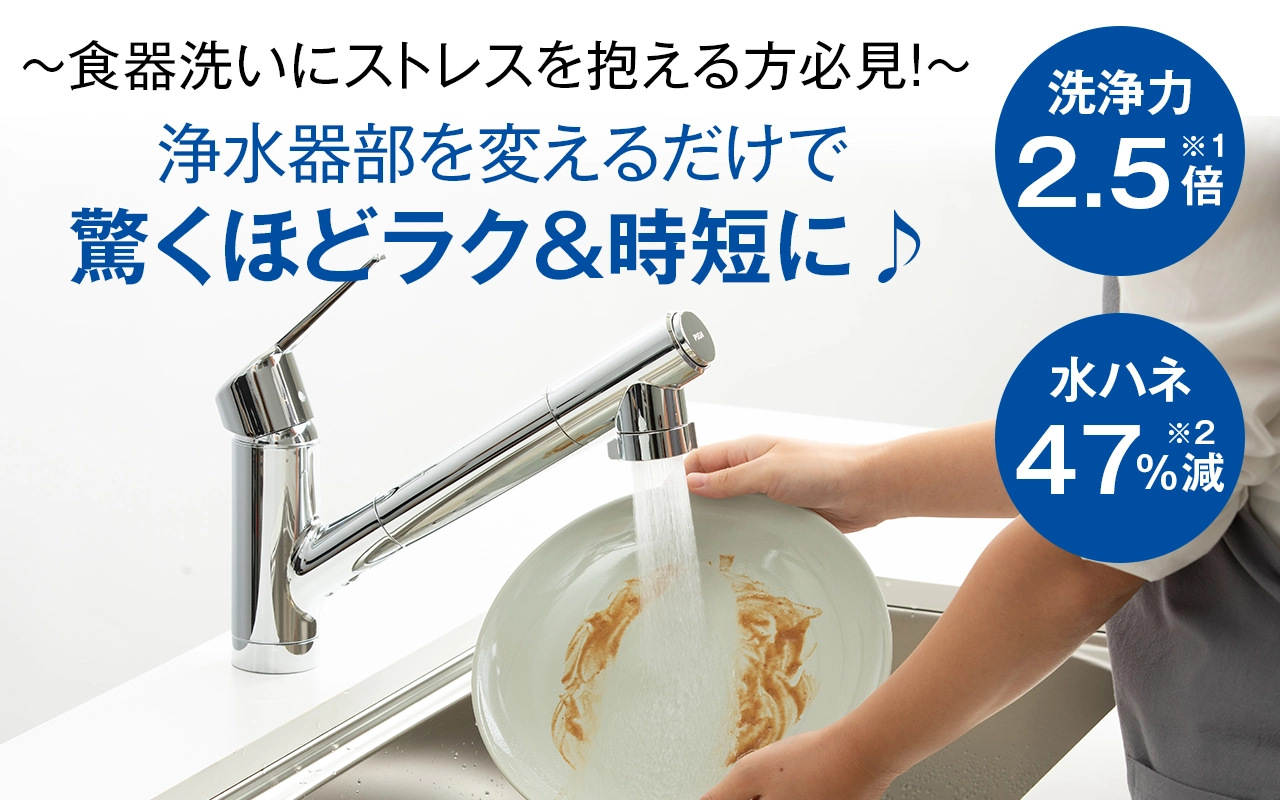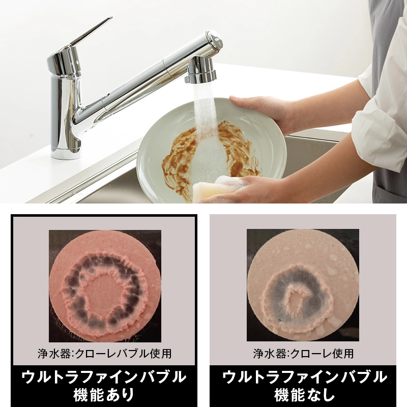 | 商品説明 | 洗浄力の高いウルトラファインバブル※1を含んだ独自のシャワー水形の力で、皿・フライパン・鍋などの油汚れや、排水溝のヌメリをしっかり落とし、毎日の洗い仕事をサポートします。 ※1:「ファインバブル」、「ウルトラファインバブル」、「FINE BUBBLE」、「FBIA」ロゴは、一般社団法人ファインバブル産業会の登録商標です。 水ハネが少ないからシンク周りの拭き取り掃除が楽になり、キッチンリセットの時短が期待できます。 |