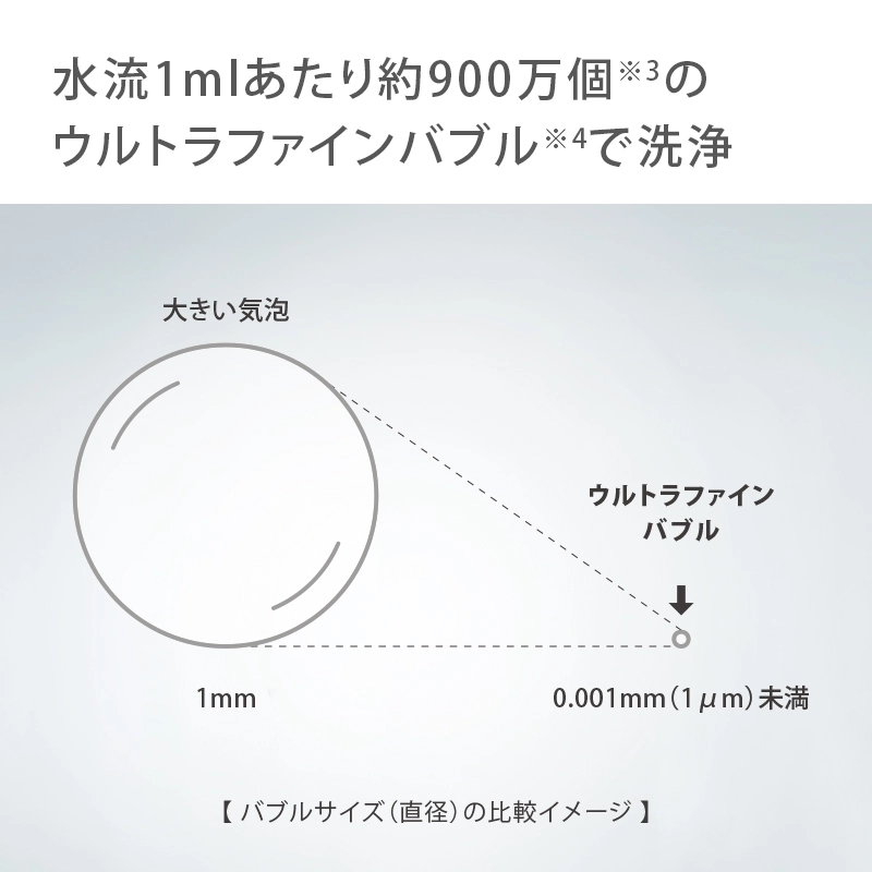 ※3 バブル数量はクローレバブルのシャワー水形で通水する前の原水と、通水して吐水された水の各々で測定した水流1mlあたりのバブル数量の差を算出した結果。数値は超純水(水温25℃±1 ℃•吐水流量8.0L/min)を使用、測定器:NanoSightNS300(FBIA指定試験機関)を用いた測定(2024年7月2日、計10回)による平均値[数量平均約879万個/ml][バブルサイズ平均径約0.1164μm、最頻径約99.4nm]◎水質環境・時期により数値は変動します。