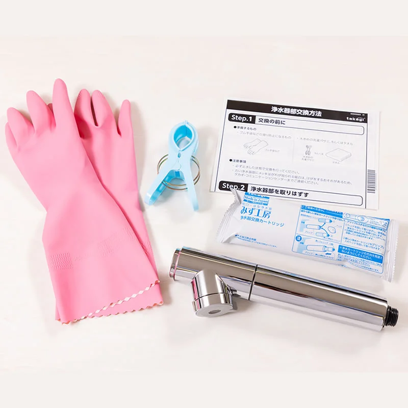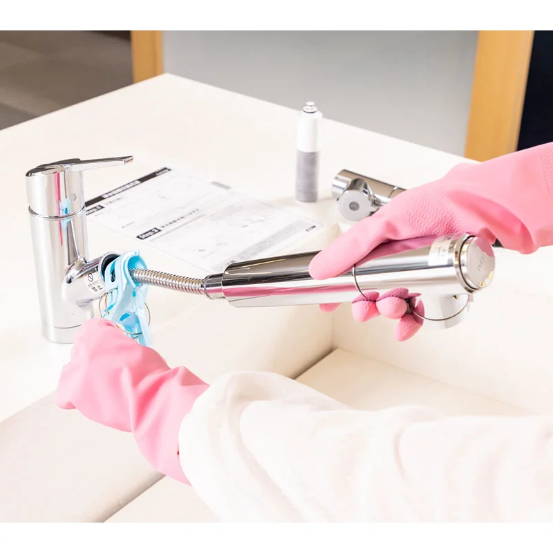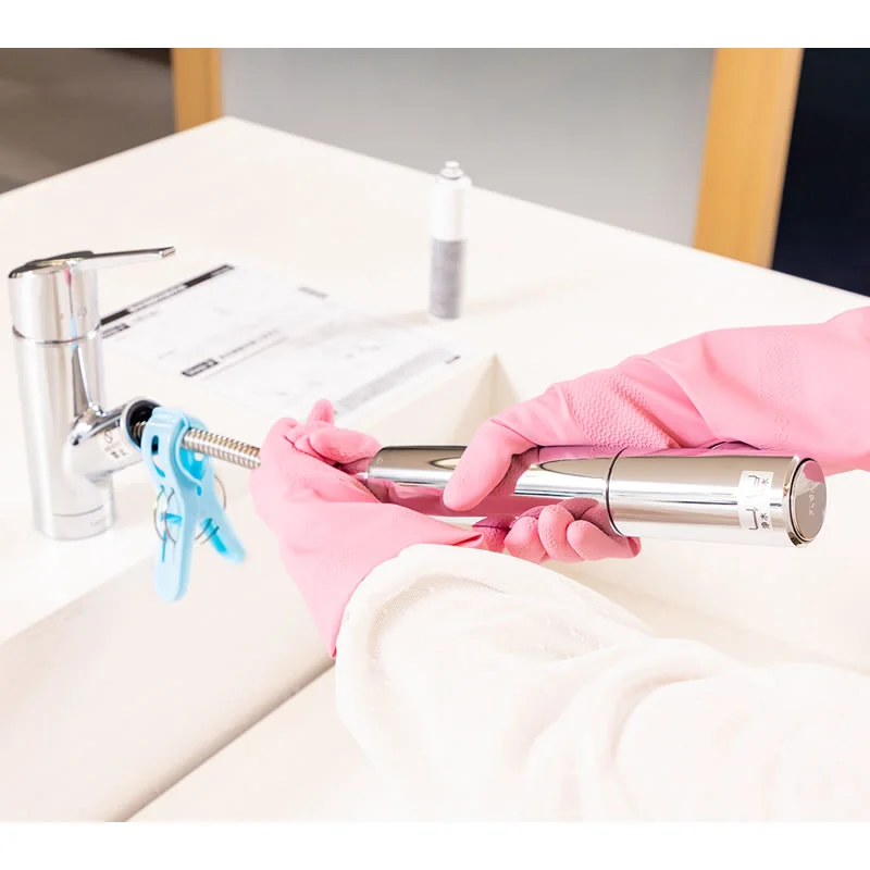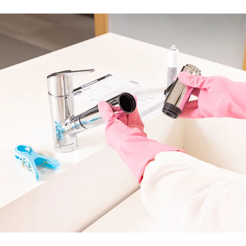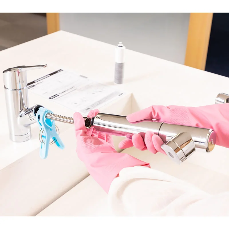 ①浄水器部の交換は、滑り防止のため、ゴム手袋をはめて行います。また、事前に大きめの洗濯ばさみ(洗濯ばさみがない場合はタオル)を用意しておきましょう。